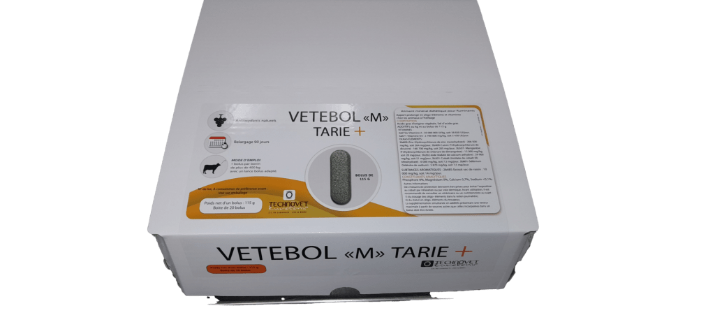 VETEBOL M TARIE + agit sur la vitalité du veau et la qualité du vêlage. Apport régulier et prolongé d’oligo-éléments et de vitamines. Meilleur colostrum → Meilleure vitalité du veau. Pour la vache → Intérêt du vêlage. Délitement sur 3 mois – 90 jours.
