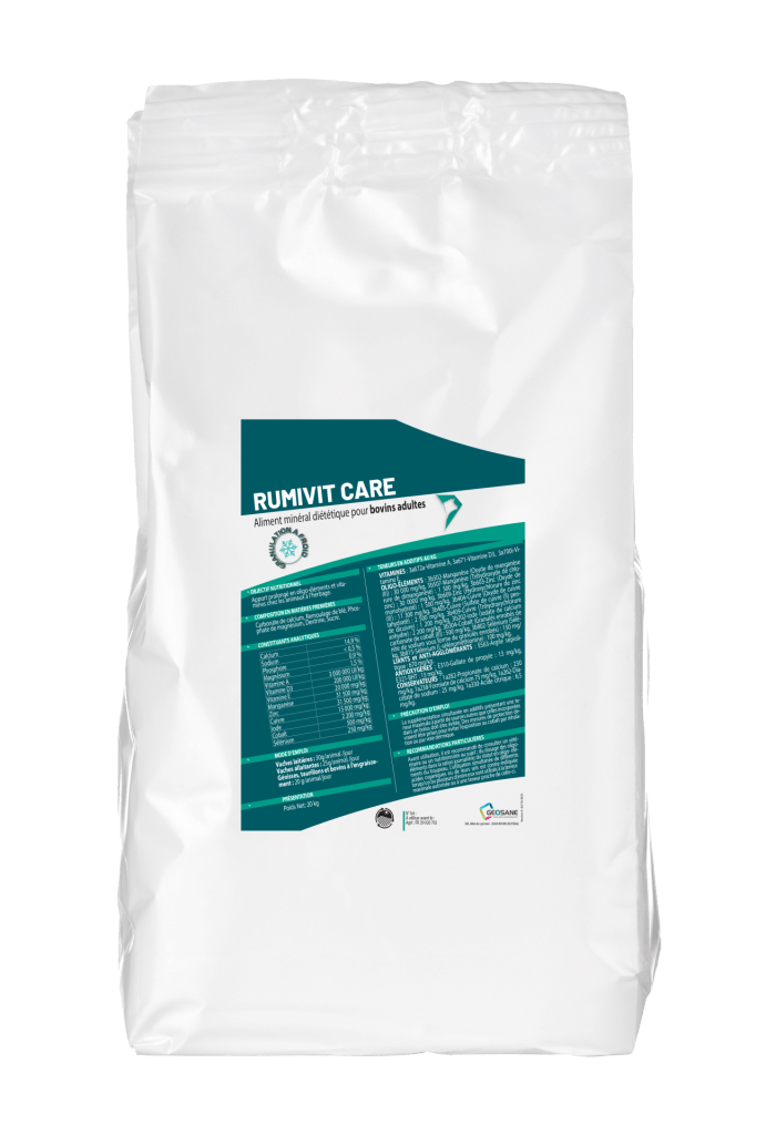 RUMIVIT CARE est une supplémentation qui s’utilise à la rentrée à l’étable et avant vêlage. La granulation à froid du RUMIVIT CARE permet la préservation des vitamines. Optimise le transfert colostral Participe à la fertilité des reproductrices, à la vitalité et l’immunité des jeunes. Antioxydants Alternative pratique au bolus